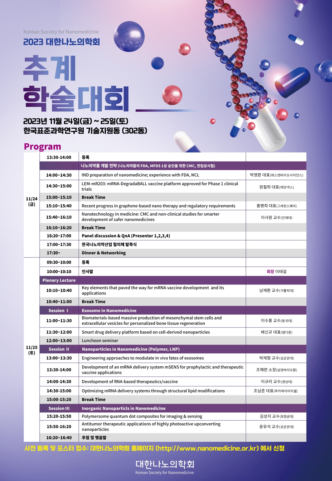 2023년 11월 24일(금)부터 25일(토)까지 한국표준과학연구원 기술지원동(302동)에서 대한나노의학회 추계학술대회를 개최합니다.